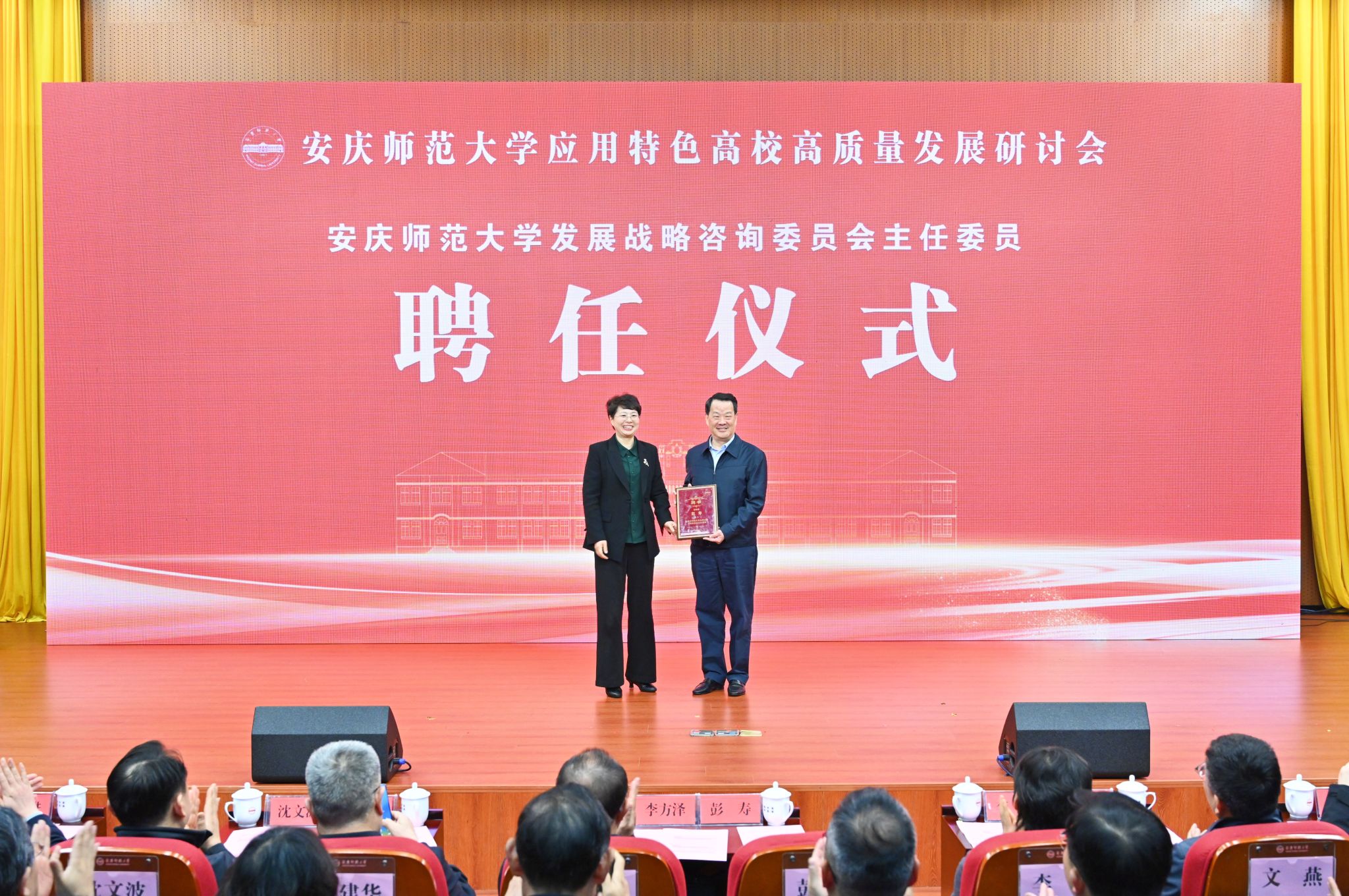彭凤莲代表学校向彭寿院士颁发安庆师范大学发展战略咨询委员会主任委员聘书并致辞。她深情回顾了学校发展历程,从特色学科专业建设、产教融合实践成效、应用型人才培养、科研平台建设等方面,介绍了近年来学校向应用型深度转型的举措与成效。她表示,学校将立足现有优势,持续守护和研究好“一山一水”,传承和发展好“一戏一文”,坚守高校服务地方发展的使命,主动担当助力革命老区振兴发展的责任。她期待,以本次研讨会为纽带,在各位专家领导、行业企业家的指导、支持与协作下,推动学校特色化、应用型深度转型发展取得更加丰硕的成果。